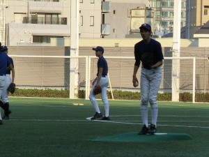考査が終わり、久しぶりに部活動解禁となったこの日、中学野球部員チームと教員チームとの対抗戦が行われました。青く晴れた空の下、空より深い青と白の爽やかなユニフォームに身を包んだ部員たちはやる気満々でした。対する教員チームもやる気満々。陽射しに負けない熱い闘志を燃やし、両者とも譲れない勝利をかけて、全力でぶつかり合いました。