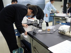 この授業に参加したのは、大学入試前に重要な化学反応等の実験操作を体験したいという生徒、すでに理系の大学への進学が決まり、大学入学後を見据えて実験操作に慣れておきたいと考えて参加した生徒など、とても意欲の高い生徒たちです。器具を用いて測定を行い、その結果から物質の質量を計算する様子は、すでに理系の大学での講義のような雰囲気です。時に教員や理科助手からアドバイスを受けながら、満足すべき成果を得たようでした。