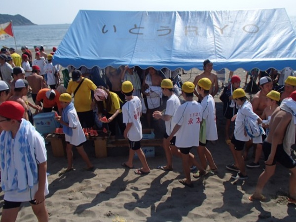 本日は、修泳最終日の様子をご紹介します。臨海学校のクライマックス、上級班の遠泳が行われる日は盛りだくさんです。中級、初級は最後の修泳ののち、スイカを頬張り、高2補助員の企画による浜レクリエーションを楽しみました。演芸、スイカ割り、クイズ大会と盛り上がったところで、遠泳から戻る上級班を出迎えます。出迎えの様子は、次回ご紹介いたします。