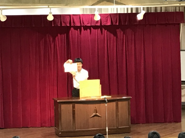去る2月15日(水)5時間目の特活の時間を利用して、中1学年は英会話「ファイナル・プレゼンテーション」を行いました。パフォーマンスを行なったのは各クラスの予選を勝ち抜いた10のグループです。