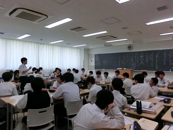 始めは、いつもと異なる試みということもあり、また、抽象的な観念を論じるということもあったためか、緊張やためらいでなかなか議論が捗らなかったところもあったようですが、5分、10分と時間が経つにつれて、いつの間にか白熱した議論になっていました。思ったことをそのまま口にすることはあっても、明確な根拠を添えて相手に伝えるということはあまり意識しない、あるいは実践していないのが常なので、かなり考え込んでから発言をすることに苦戦する生徒も。それぞれが目を皿にして本文から根拠を探し、夢中で自分の理論を組み立てていました。考えに考えた意見が相手に伝わり、理解を得られた時には達成感に溢れる表情でした。議長や書記の役を率先して引き受ける生徒や対立意見を掘り下げる生徒もさることながら、普段は大人しい生徒が冷静に相手の意見の根拠の矛盾をついたり、受け身になりがちな生徒が班のメンバーに解釈した内容の確認をしたり、いつもとは異なる一面も見られました。同年齢の班のメンバーとやりとりをすることで、テーマを自分のこととして捉えることができたり、教え合いによって理解を深めていたりしたようです。予想以上に議論が盛り上がり、小説という自分の世界とは関わりのない世界を自分のものとして考えられ、良い意味でむきになることができていました。
