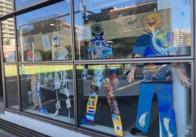 作品のテーマは、「自分の中身」というもので、自分の中身を考えて表現し、他者の内面を理解し、共存することを考えるためのコラージュ作品です。頭の横の部分に下書きが貼られていて、この部分が、ハンマーヘッドのように見えたんですね。生徒たちの個性あふれる作品が勢揃いしています。