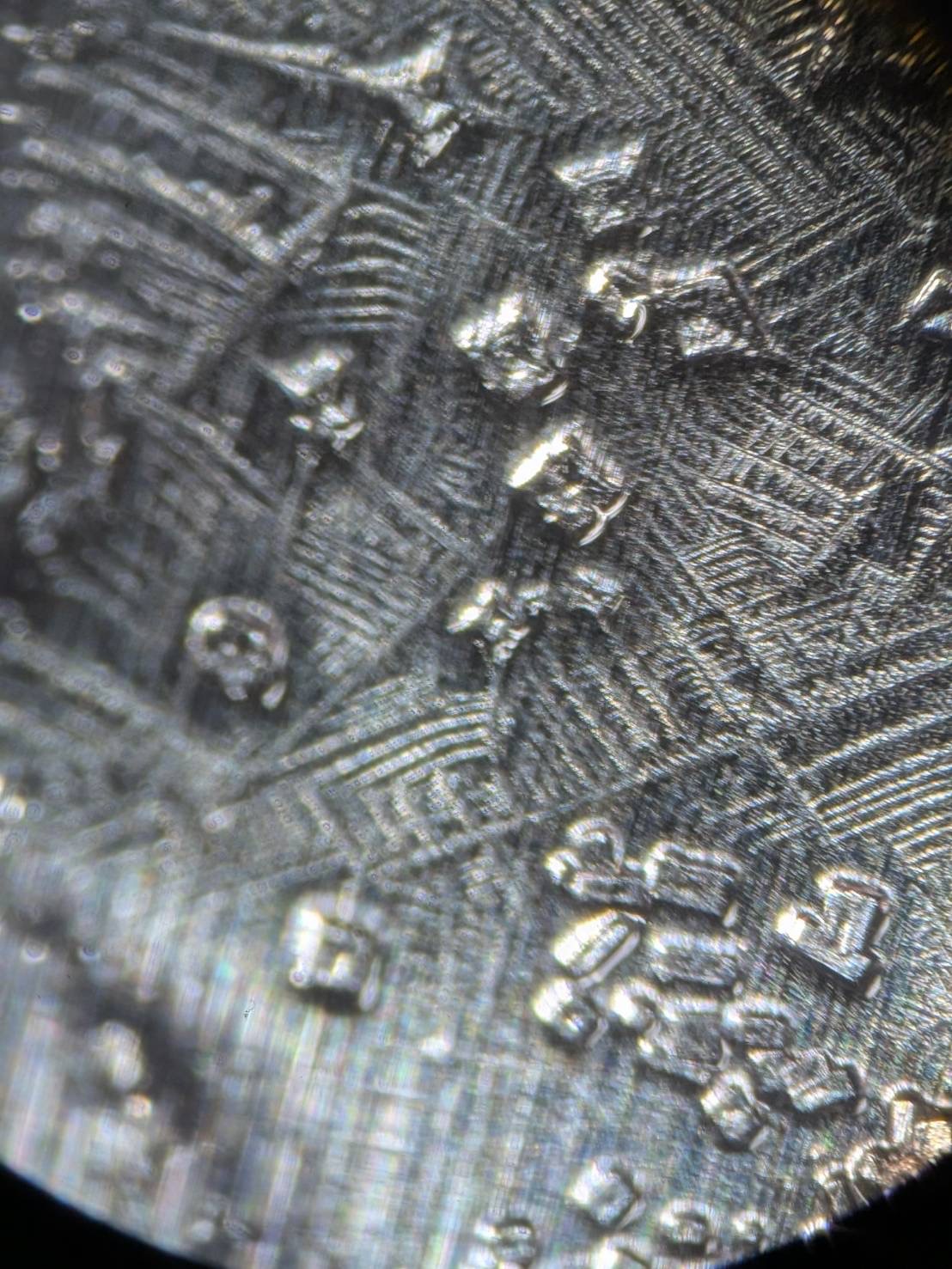 観察していた間、アルミホイルの上で、さらに水分が蒸発していました。おやおや種結晶もあります。アルミホイルも顕微鏡で見るとスタイリッシュでカッコいい模様ですね。