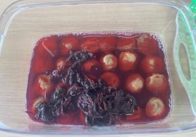 今回は市販の赤紫蘇&梅酢を使用しました。白梅酢に、赤紫蘇エキスを注入すると、濃赤紫色から明るい赤色へ変化します。