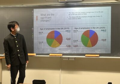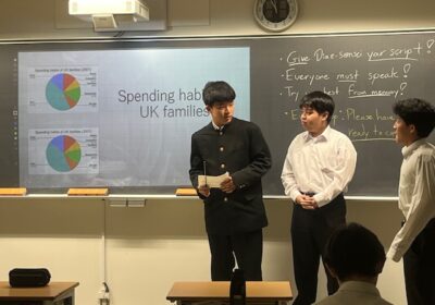 見学したのは、高校1年生の英語の授業でした。そこでは、データ分析をもとにした英語プレゼンテーションが行われていました。各班がイギリスの社会データをテーマに設定し、統計資料を読み取り、パワーポイントを用いて英語で発表しています。