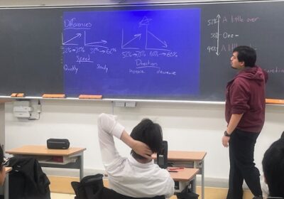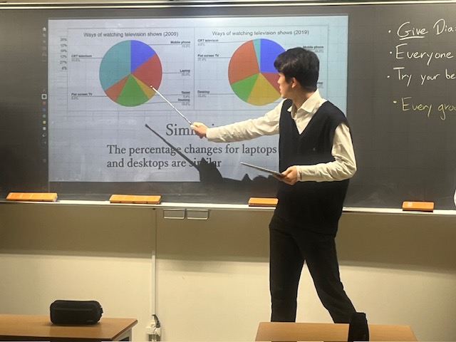 「何をしているのだろう」と思い、そっと中に入ってみると、数名の生徒が黒板の前に立ち、発表を行っています。黒板に映し出されていたのは、英語で作成されたPowerPointの画面。円グラフや統計データが大きく映し出されていました。