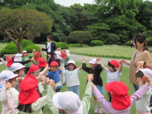 グループのお友達と手を繋ぎ輪になって、前後にジャンプをしたり、バンザイやしゃがんだり、お題に合わせてみんなで動きました。