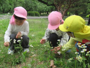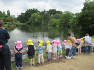 友達と手を繋ぎ散歩をし、植物に触れてみたり、池にいる生き物をみんなで探しました!