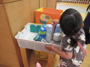 まず初めに登園するとコップや水筒をだして朝のお支度をします。
