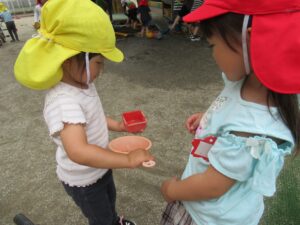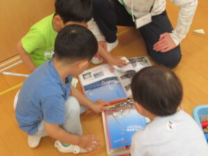 年長組や年中組のお兄さんお姉さんに色々教えてもらったり一緒に遊ぶ姿も見られます。