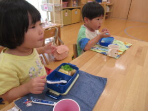 お家の方が作ってくれたお弁当をおいしく食べています。