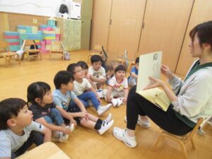 お帰りは、タオルを畳んだりシールノートにシールを貼ったりお支度を済ませ紙芝居や絵本などの楽しいお話を聞きます。