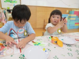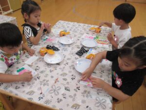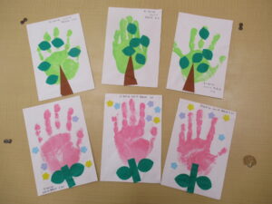 年少組は子ども達の手形をとり、手形を一枚は花にもう一枚は木に見立てて、お手紙作りです。