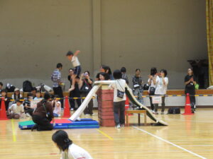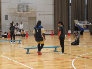 勝ったら、平均台を降りて、負けたら平均台を最後まで進み、その場所から抱っこをしてもらって、次の人にバトンタッチとなります。