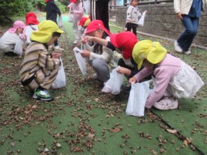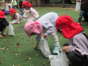 「みて!こんなに拾ったよ!」と、どんぐりでパンパンになった袋を見せてくれました。