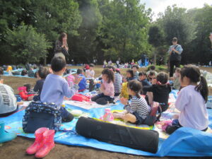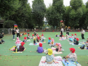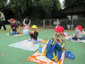 そのあとは、ふれあい遊びをしたり、お待ちかねのお弁当も、ペアになったお友達同士隣にレジャーシートを敷いて楽しく食べました。