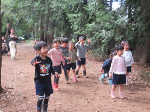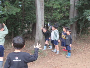 年中組と年少組でペアになり、一緒にどんぐり探し開始です!