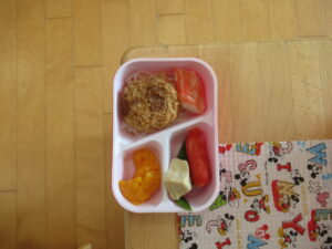 この日のメニューは、メンチカツ、ビーフンソテー、きぬさや、しまじろう高野豆腐、赤ウインナー、カニしぐれ、フルーツ(みかん)、デザートゼリーでした。