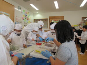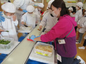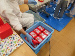 こども用給食製造ベルトコンベアで流れてくるお弁当の箱に落とさないように、慎重に入れますが、ゆっくりやると、あっという間に自分の場所を通り過ぎて行ってしまします。最初は緊張していた様子でしたが、慣れてくるととても上手にできていました。