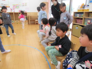 椅子をお兄さん、お姉さんが持ってあげて「こっちだよ!一緒に座ろうね。」と優しく声をかけてあげていました。
