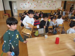 荷物が多いので年長組は年少組のお部屋へ迎えに行くことにしました。