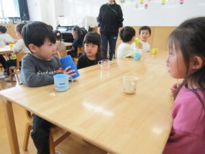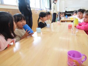 一年間ずっと歌ってきたこの歌も、今日は遊戯室いっぱいに元気な歌が響きわたりました。「いただきます!!!」
