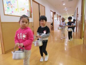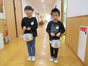 支度がおわったら、今日は各クラスのお当番が一緒にやかんを運んでくれました。