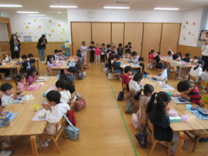 遊戯室に集まって、ひとつの机に年少・年中・年長組が座ります。