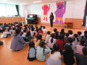 まずは、全園児が遊戯室に集まって園長先生から